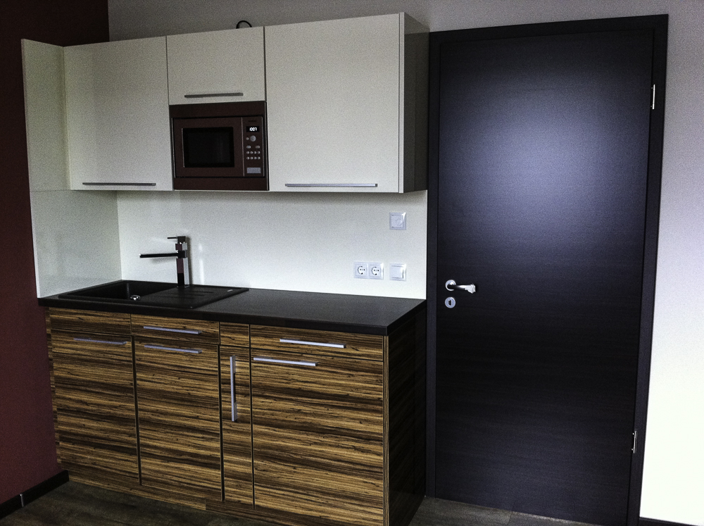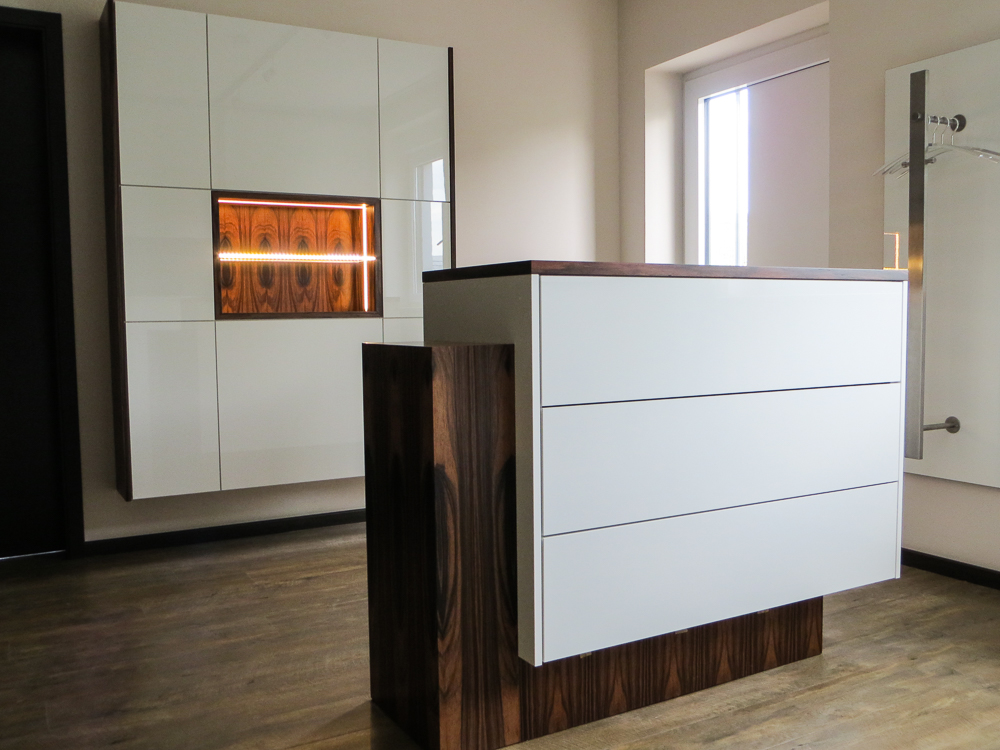 Empfangsbereich weiß hochglanz in Kombination mit Echtholzfurnier Makassar, LED-Beleuchtung