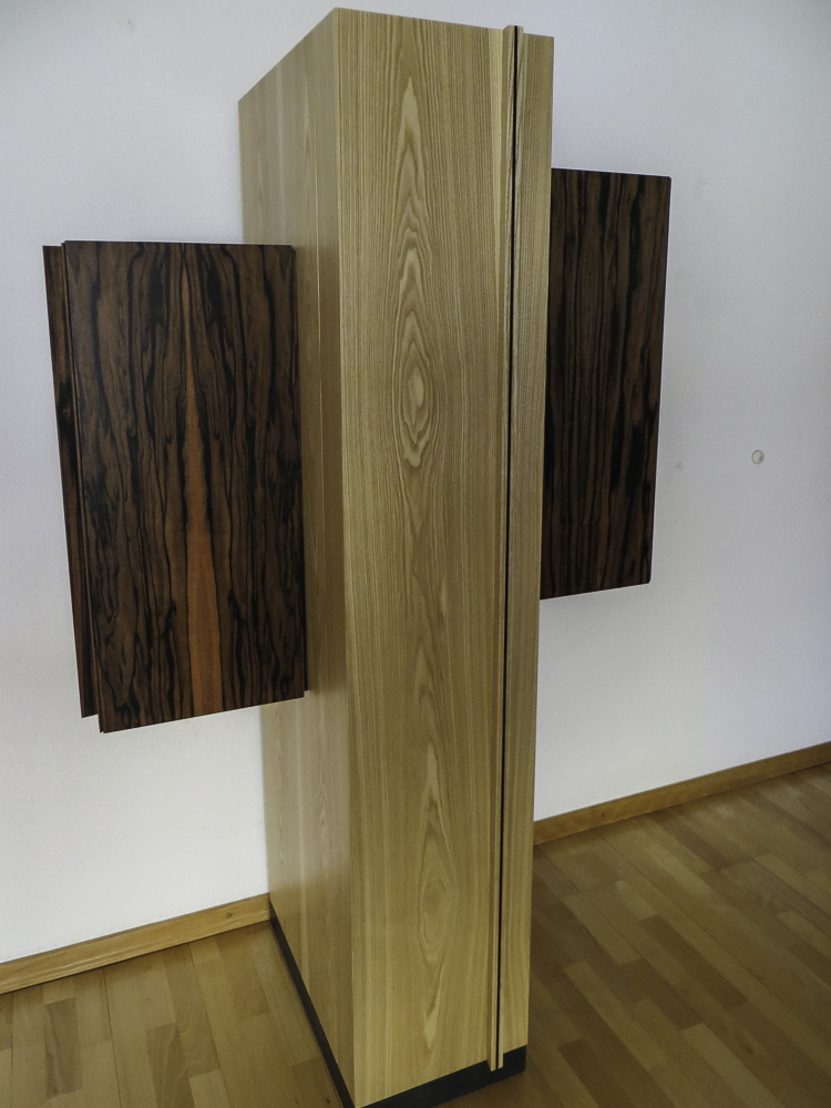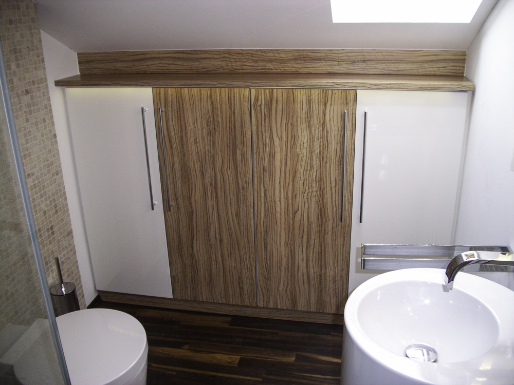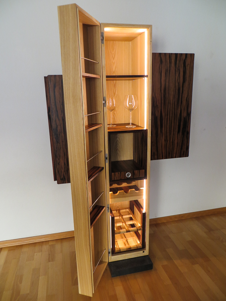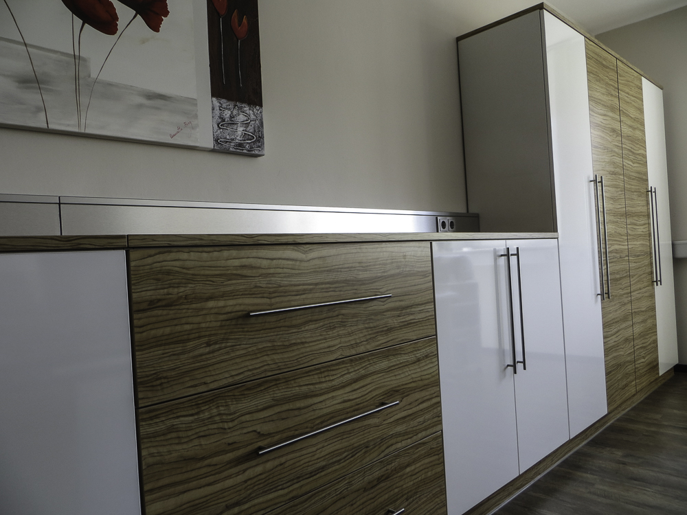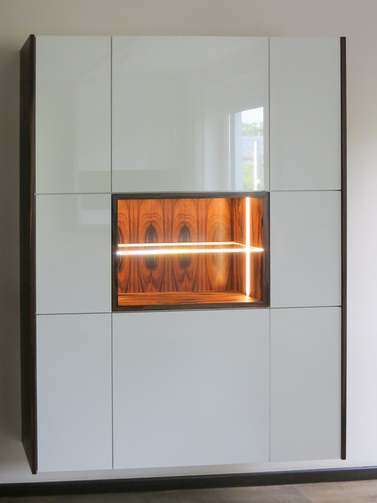 Schrankmodul weiß hochglanz mit Echtholzfurnier Makassar, LED-Beleuchtung