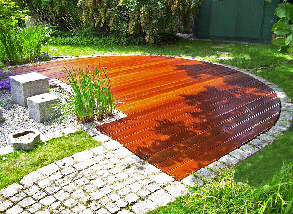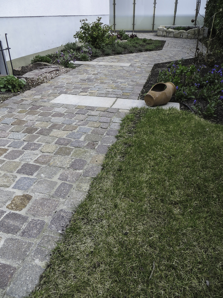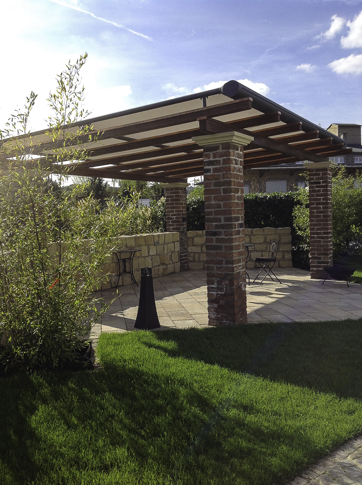 Sitzplatz im Garten, Bruchsteinmauerwerk, Platten: Longara, Pergola mit Sonnenschutz