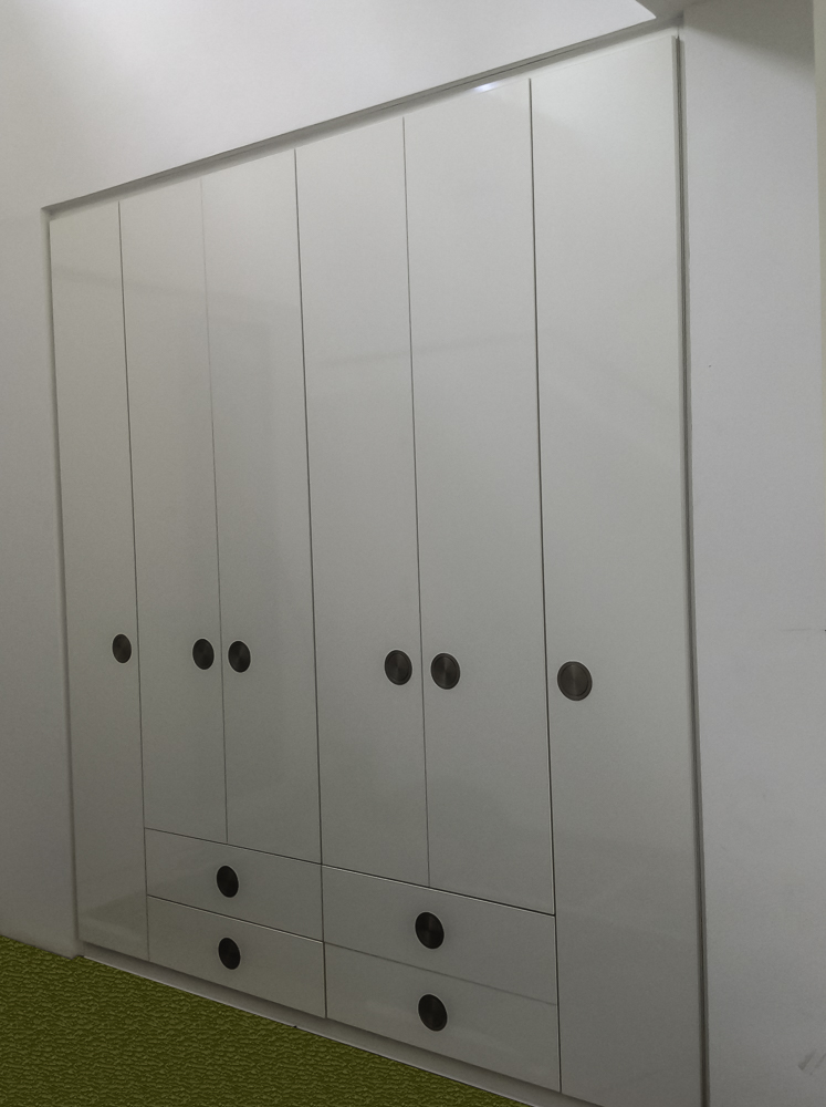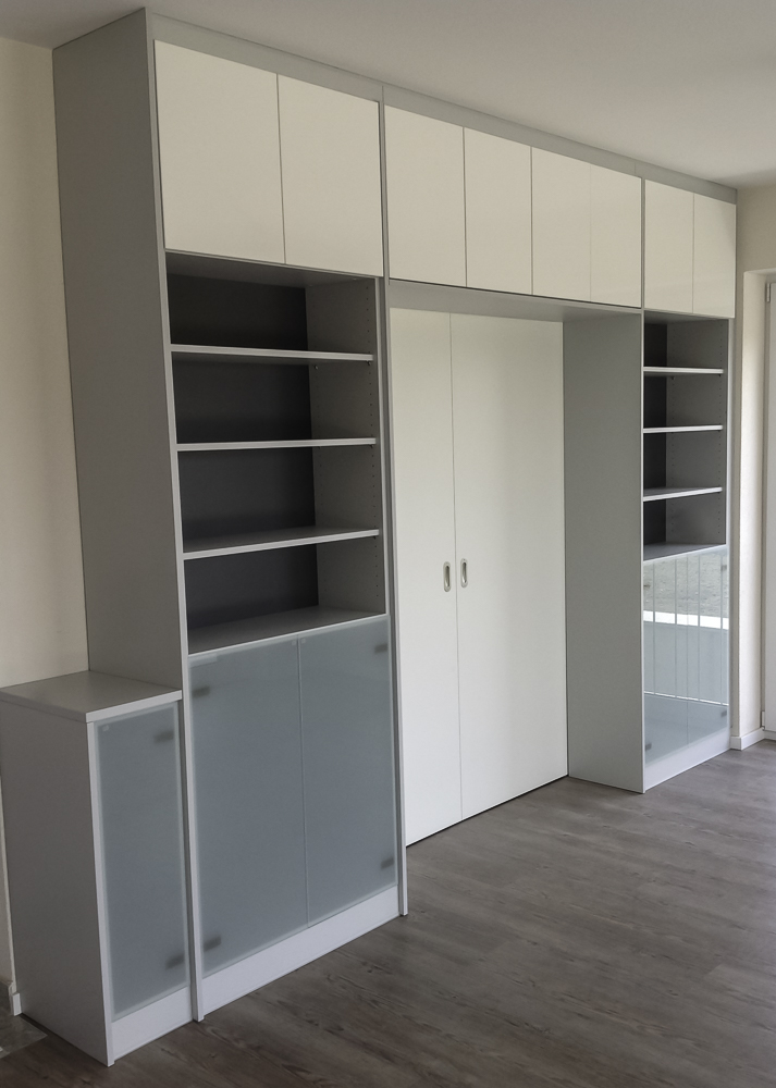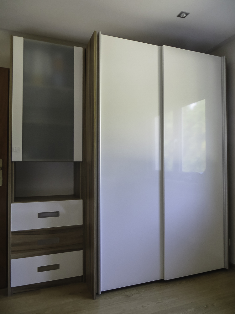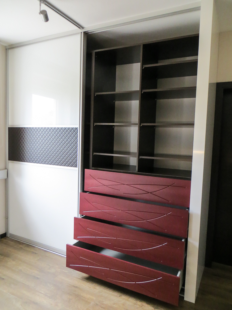 Schiebetürenschrank, Füllungen mit lackiertem Glas und Ledereinlage, Organisationsmodul