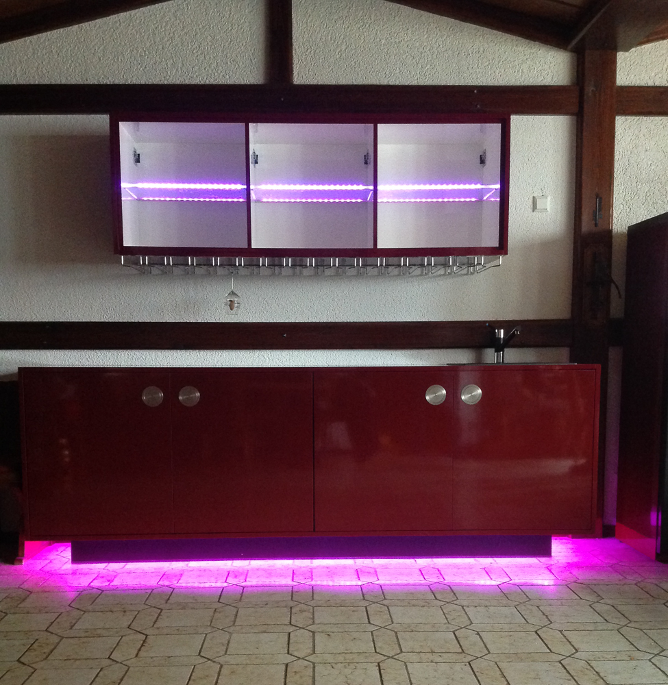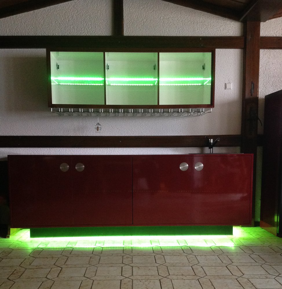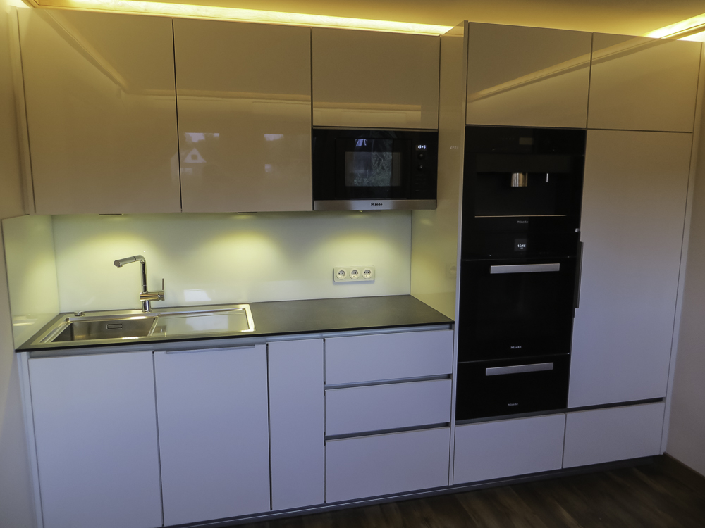 Küche, weiß hochglanz, grifflos mit indirekter LED-Beleuchtung, Arbeitsplatte: Vollkernplatte; schieferfarben