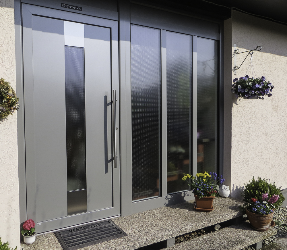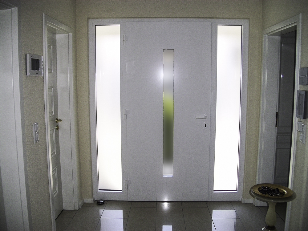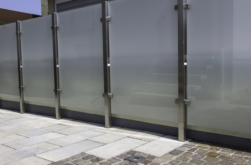Sichtschutz, Edelstahlposten in Kombination mit satiniertem Glas