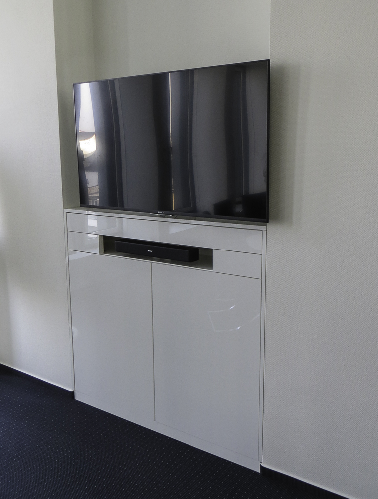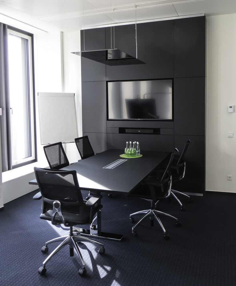Besprechungstisch mit Media Wand, Material: Arpa fenix, schwarz matt, grifflos